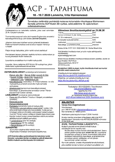 Meillä, oli niin ihanaa aikaa - oli niin mahtavaa viettää iltaa Markon ja Eevan kotona, tavata Ruu, Baggings, Dom ja Ronja sekä pienet pakastepennut. Ja niin upeaa seikkailla paikallisella alueella Mallun, Eevan, Eijan ja Tean kanssa ennen kuin lensimme kotiin. Kiitos teille kaikille vieraanvaraisuudesta, urheilullisuudesta ja innokkuudesta – ACP-klubiin tuleminen on meille kuin Corydon ”patterien” lataamista – se antaa meille uutta toivoa, että tulevaisuus näyttää hyvältä rodullemme. Me otamme katseen kohti jo vuotta 2026 – joka on todella erityinen, koska se tulee olemaan ACP-Klubin 30-vuotis juhlavuosi ja minun isäni 90 syntymäpäivä vuosi.